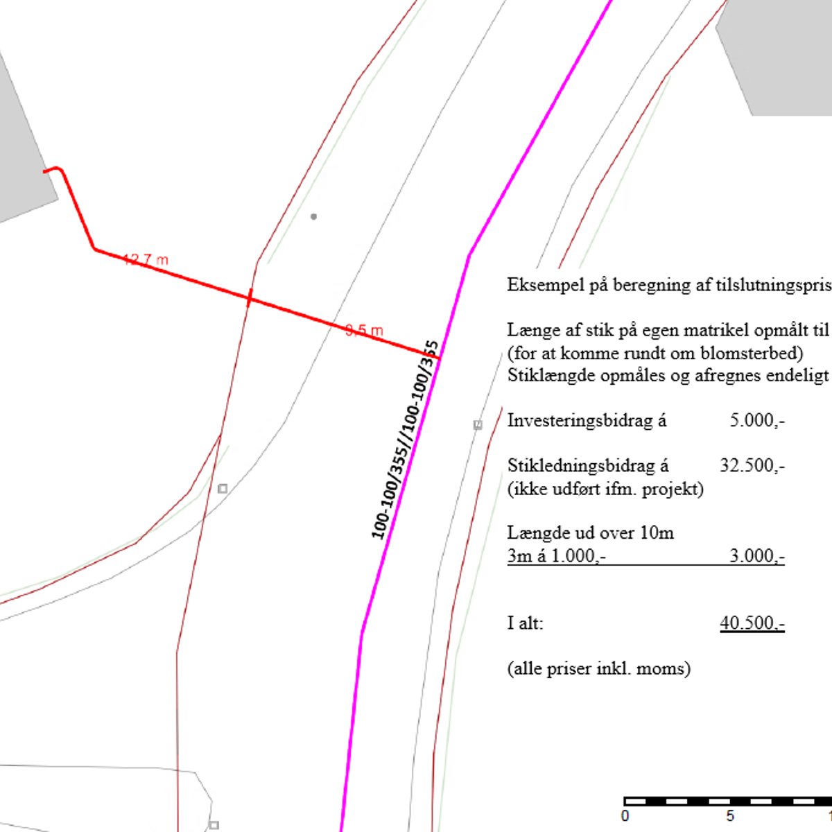 * Hvis aftalen indgås efter gravearbejdet for hovedledning ud for ejendommen er afsluttet, afregnes stikledningsbidrag iht. gældende takstblad og vilkår med 32.500,- kr. med tillæg for evt. længde ud over 10 meter.